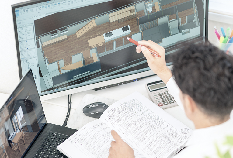 完成イメージが決まったら、施工の情報が全て詰まった3D図面を作成いたします。3D図面は必要に応じてVRで見ていただき、使う資材の選定や、什器・設備・照明の位置、通路の動線、バックヤードの寸法といった、細かい使い勝手まで着工前に正確に確認できるので、「イメージと違う」というリスクがなくなります。
