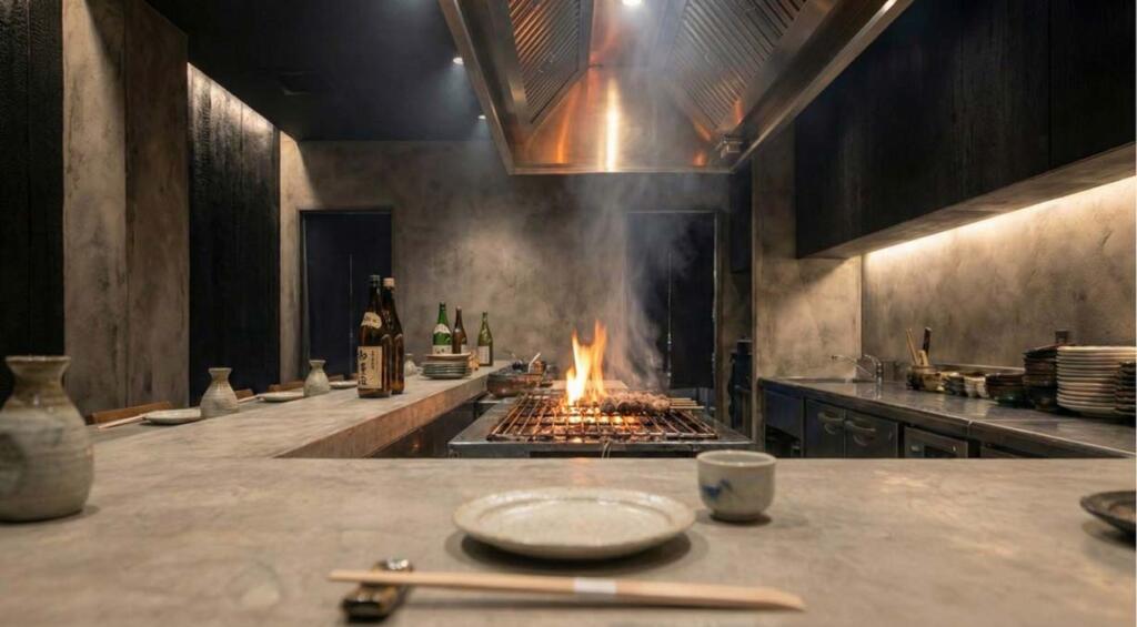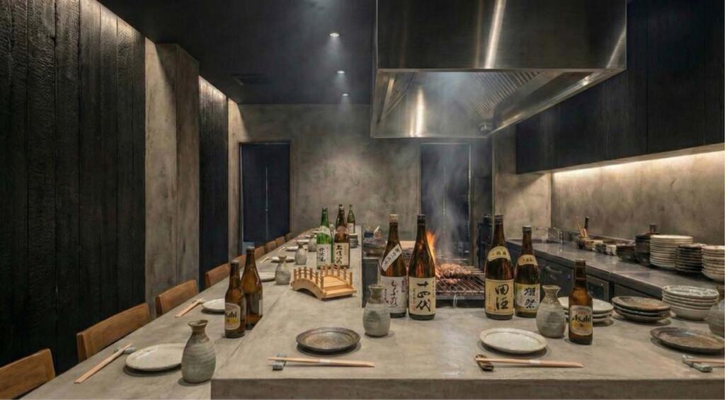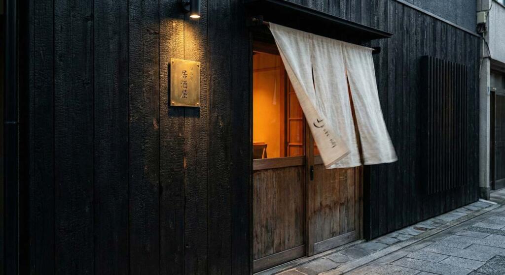 外観の黒に合わせモノトーンでシックな印象のある居酒屋の店舗イメージです。